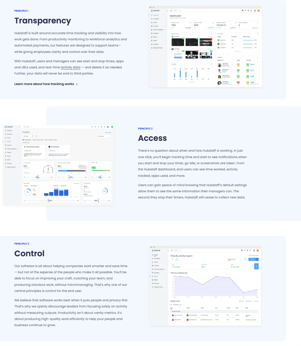 The screenshot combines Hubstaff's three guiding principles: transparency, access, and control.