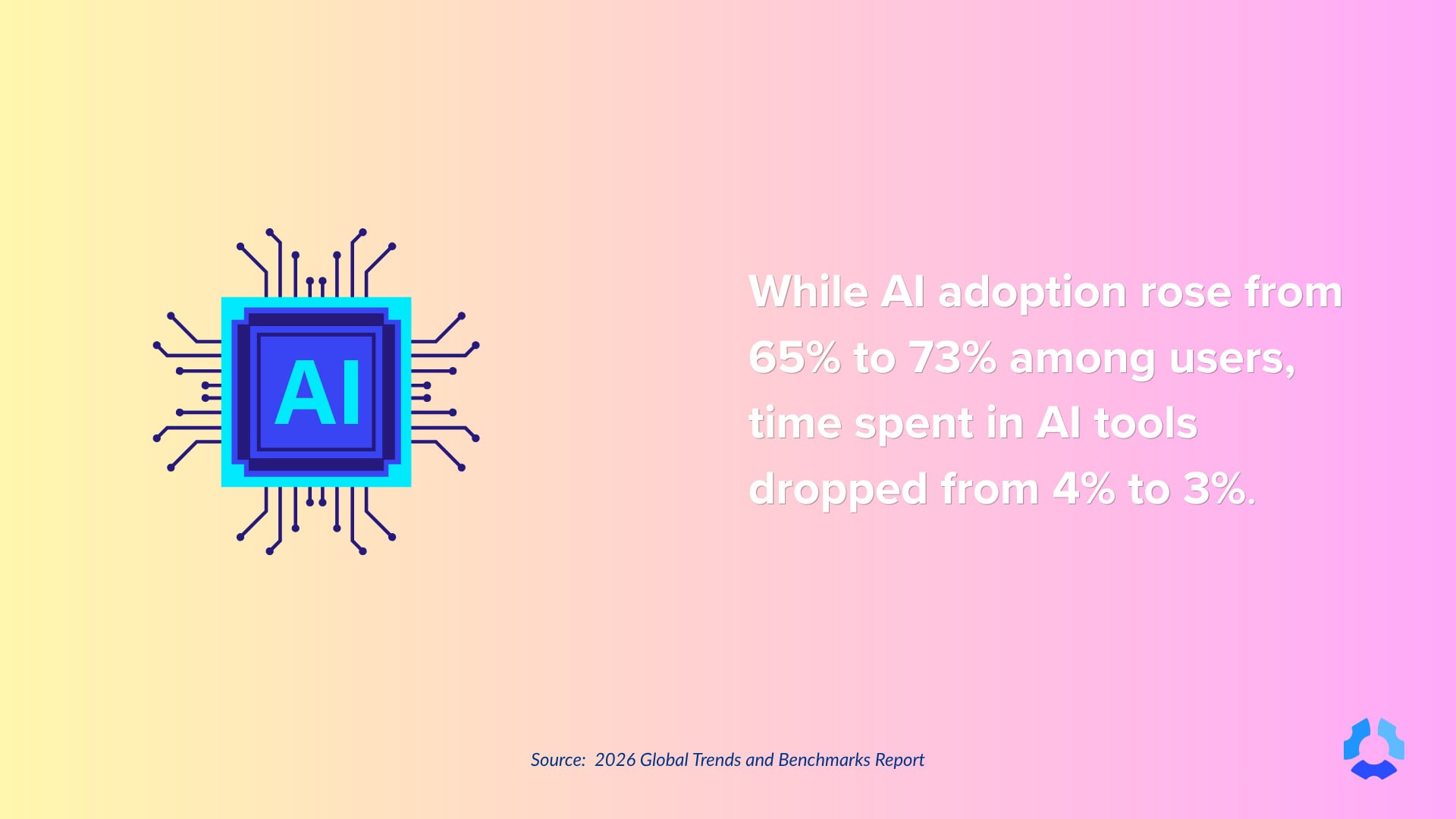 While AI adoption rose from 65% to 73% among users, time spent in AI tools dropped from 4% to 3%, indicating increased usage without deeper integration.