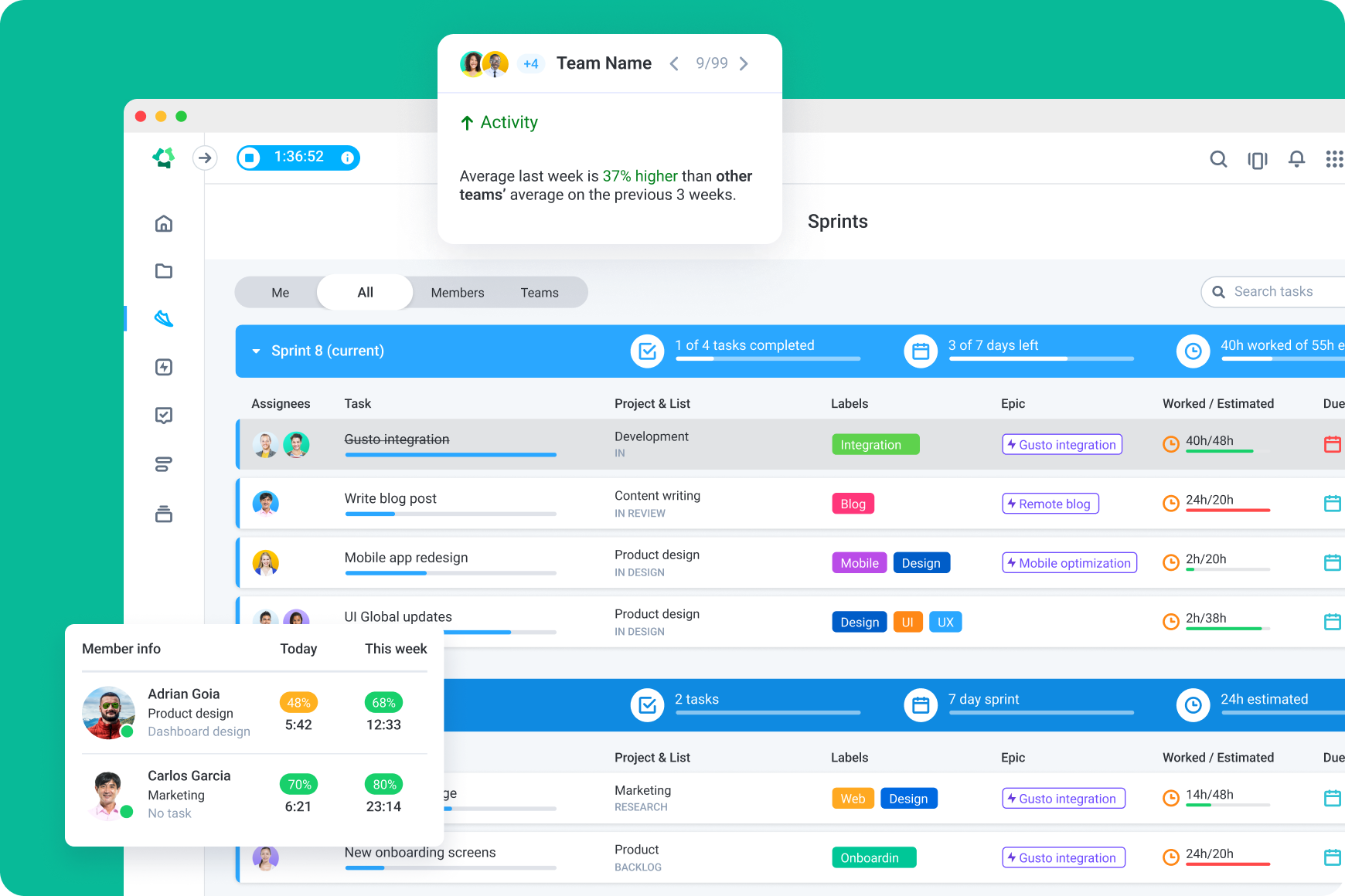 Tracking works best when you can get as granular as possible. Integrating your tracker with project management tools helps you align with broader projects while also providing insight into the time spent on tasks that contribute to your progress. With time logs feeding directly into tasks and milestones, you can stop chasing status updates and start working toward outcomes.