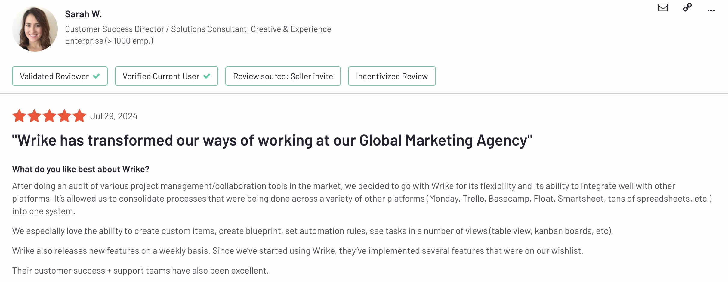 Wrike uses an Agile methodology and custom workflows that ensure good outcomes. This is especially true when creating workflows of the process in software project management.
