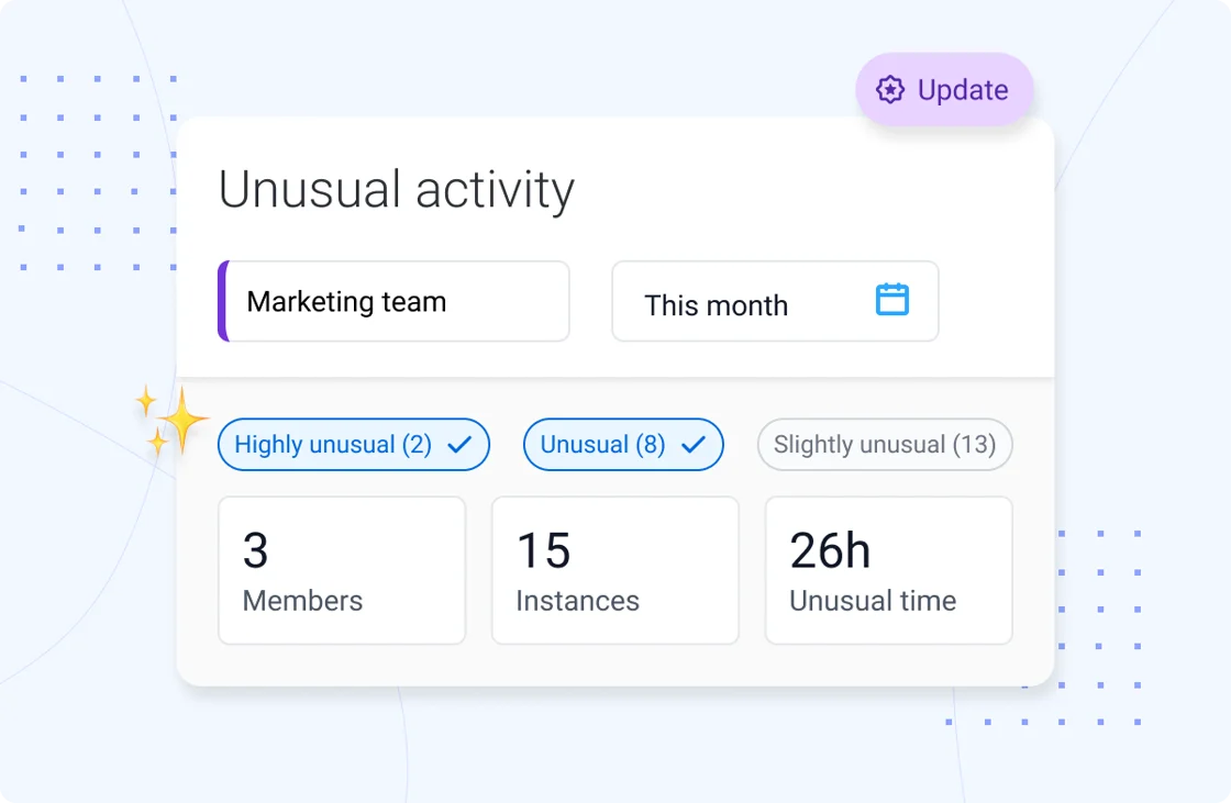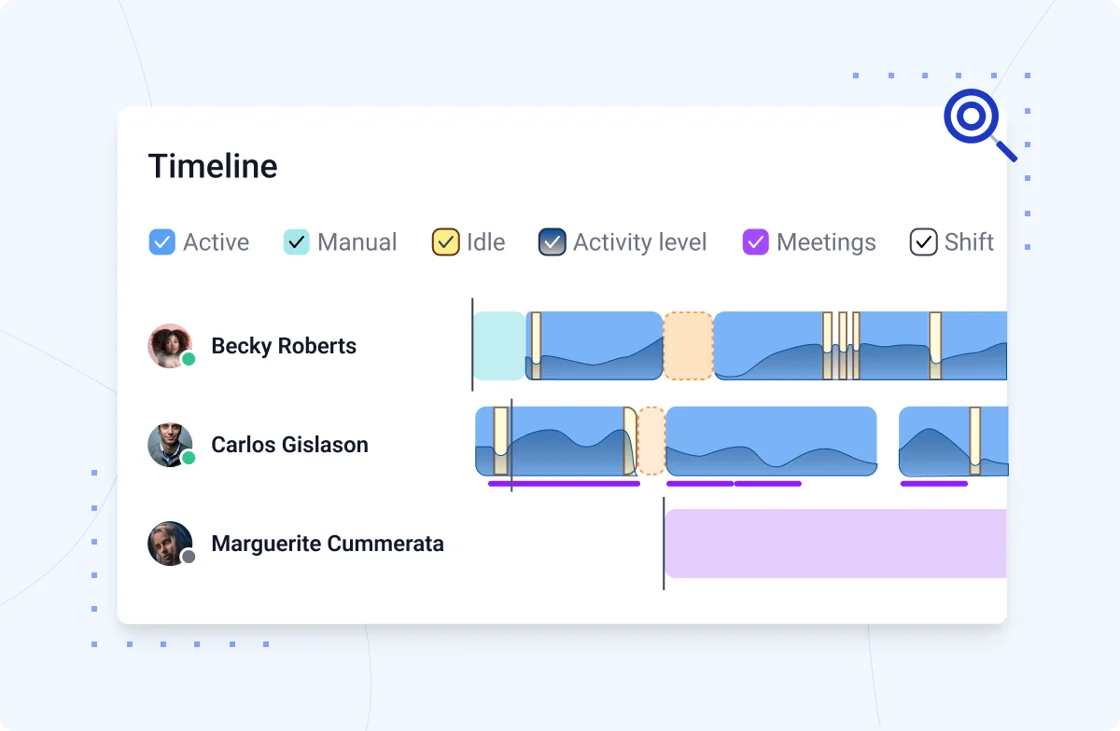 See exactly when your team worked, went idle, logged manual time, joined meetings, took breaks, or used PTO – all in one view.