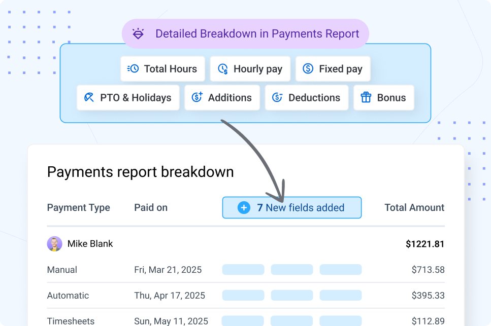 We’ve enhanced the Payments report to give you more visibility into payment details. You’ll now see a clear breakdown of each payment, including hours worked, fixed rates, PTO & holidays, bonuses, additions, and deductions.