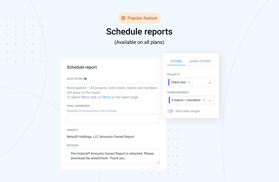 Unlimited scheduled reports are now available on all Hubstaff plans! Teams on our Starter and Grow plans can now save time and stay informed by automating report delivery straight to your inbox.