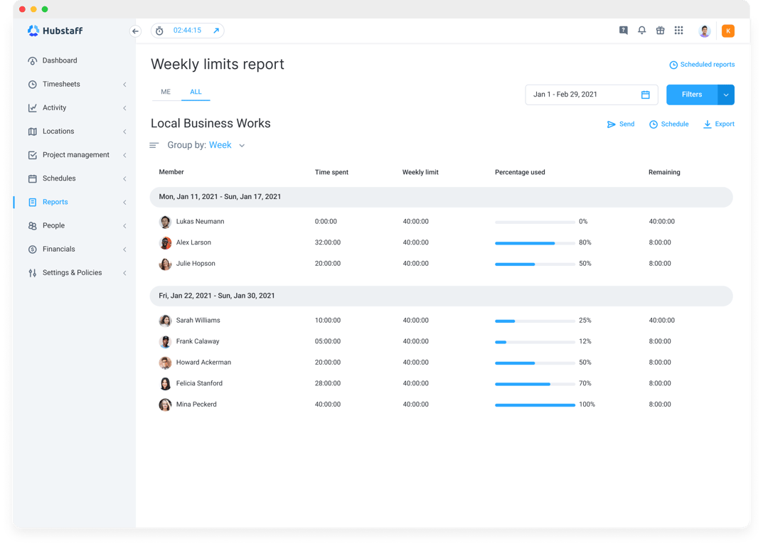 Easily manage remote workers or field teams with attendance and scheduling features. Create schedules in a simple calendar view, assign shifts, and get notified if someone is late or misses work. Hubstaff also has built-in GPS capabilities and geofenced Job sites to automate clock-ins and clock-outs for field teams.
