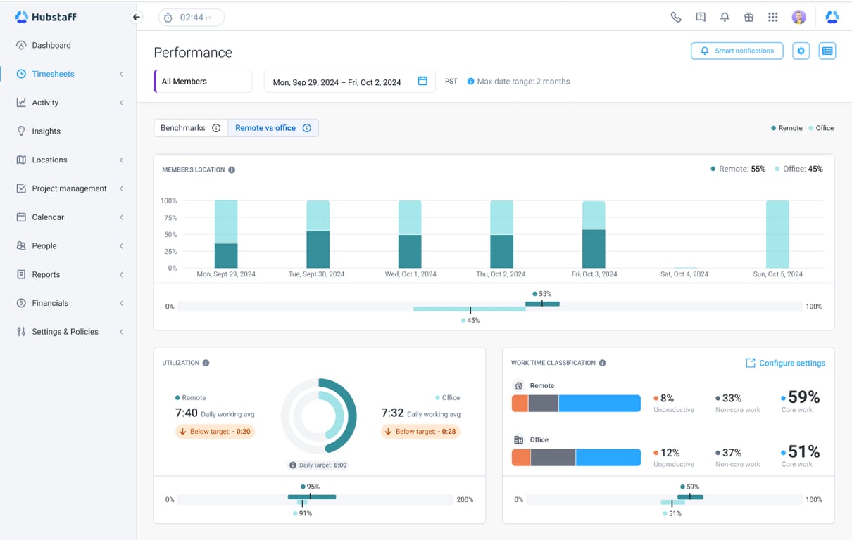 Explore how Hubstaff helps support a remote workforce with integrations, time tracking, task management, and workforce analytics — all designed to improve hybrid work performance.