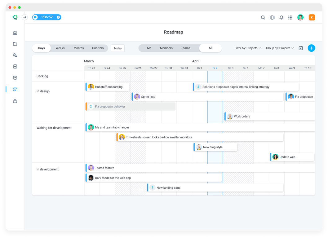 For teams that share resources, the Roadmap can ensure that you’re not double-booking anyone for crucial projects. View by individual team members, teams, or the entire company. Avoid bottlenecks that happen when too many projects pile up with one person.