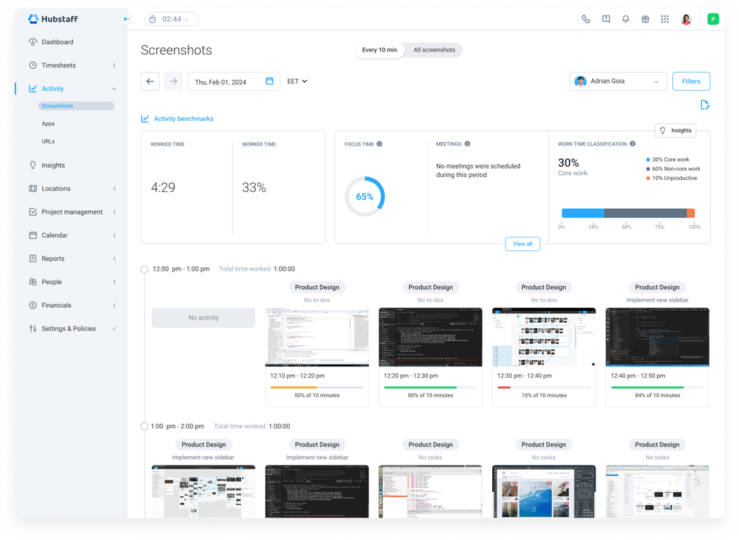 Once everything is set up, users can begin tracking time. Hubstaff's screenshot monitoring software runs in the background on the desktop, automatically capturing screenshots and logging time based on the settings you’ve applied. You'll get a detailed breakdown of hours by project, along with visual records for each team member.